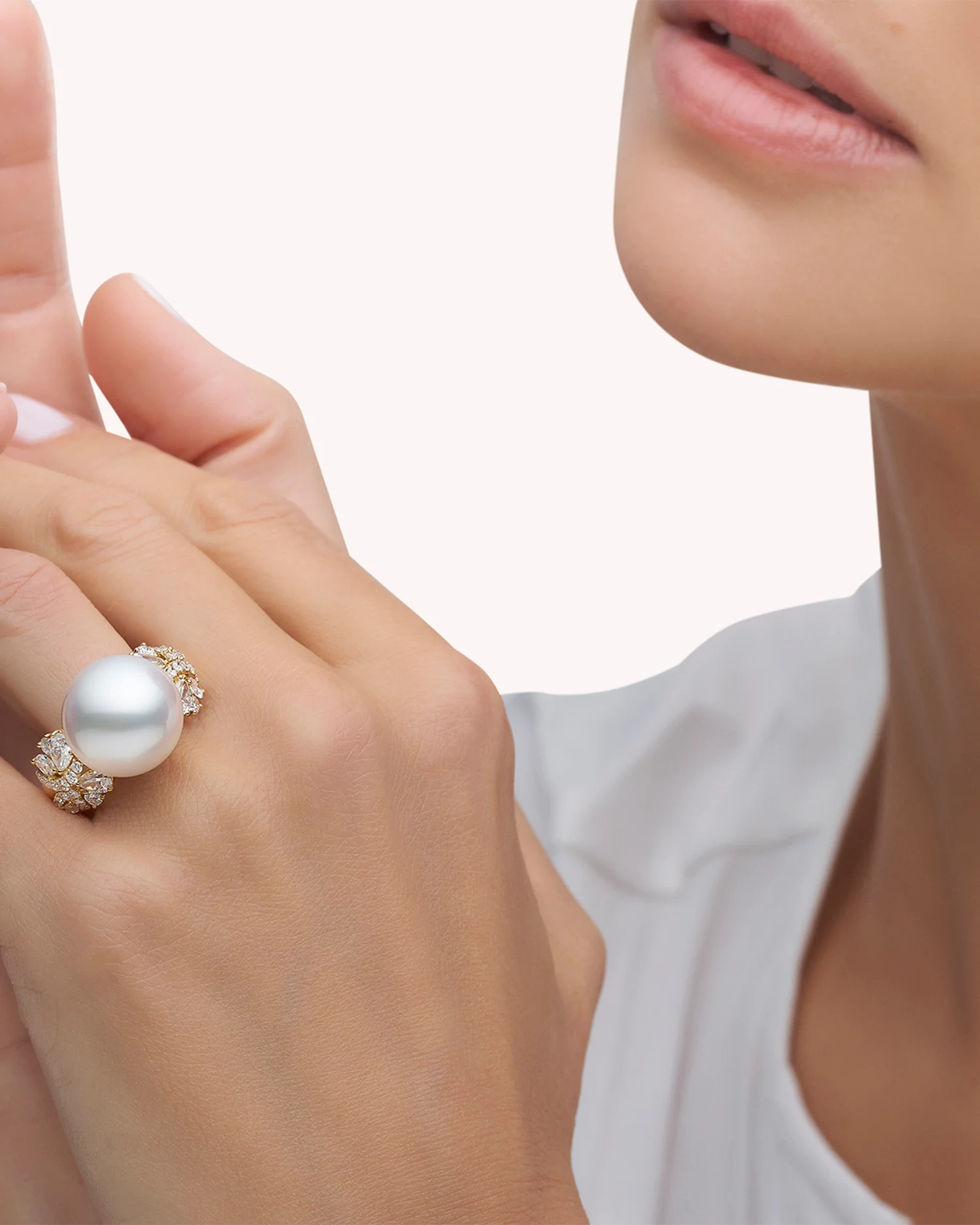Diamond Dragonfly Pearl Ring | 15mm Round Pearl, Diamonds, and Yellow Gold
