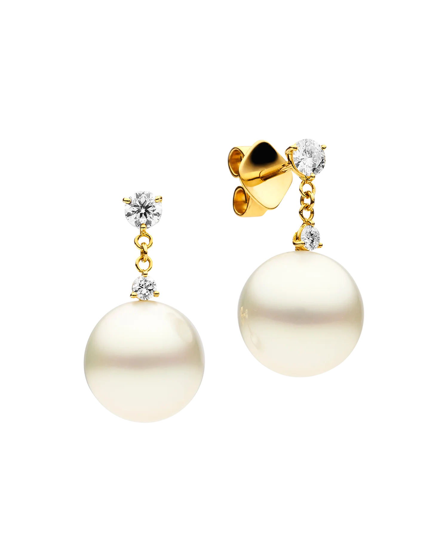 Diamond Dew Drop Pearl Earrings | 11mm Round Pearls, Diamonds, and Yellow Gold