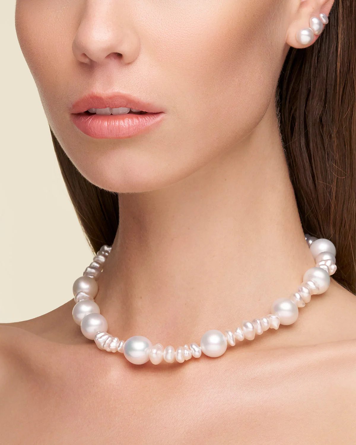 The Wild Choker Strand - Grande features Australian South Sea Pearls in unique and varying shapes, complete with a sparkling white diamond. Wear the ocean upon your skin with this stunning keshi and baroque pearl necklace.