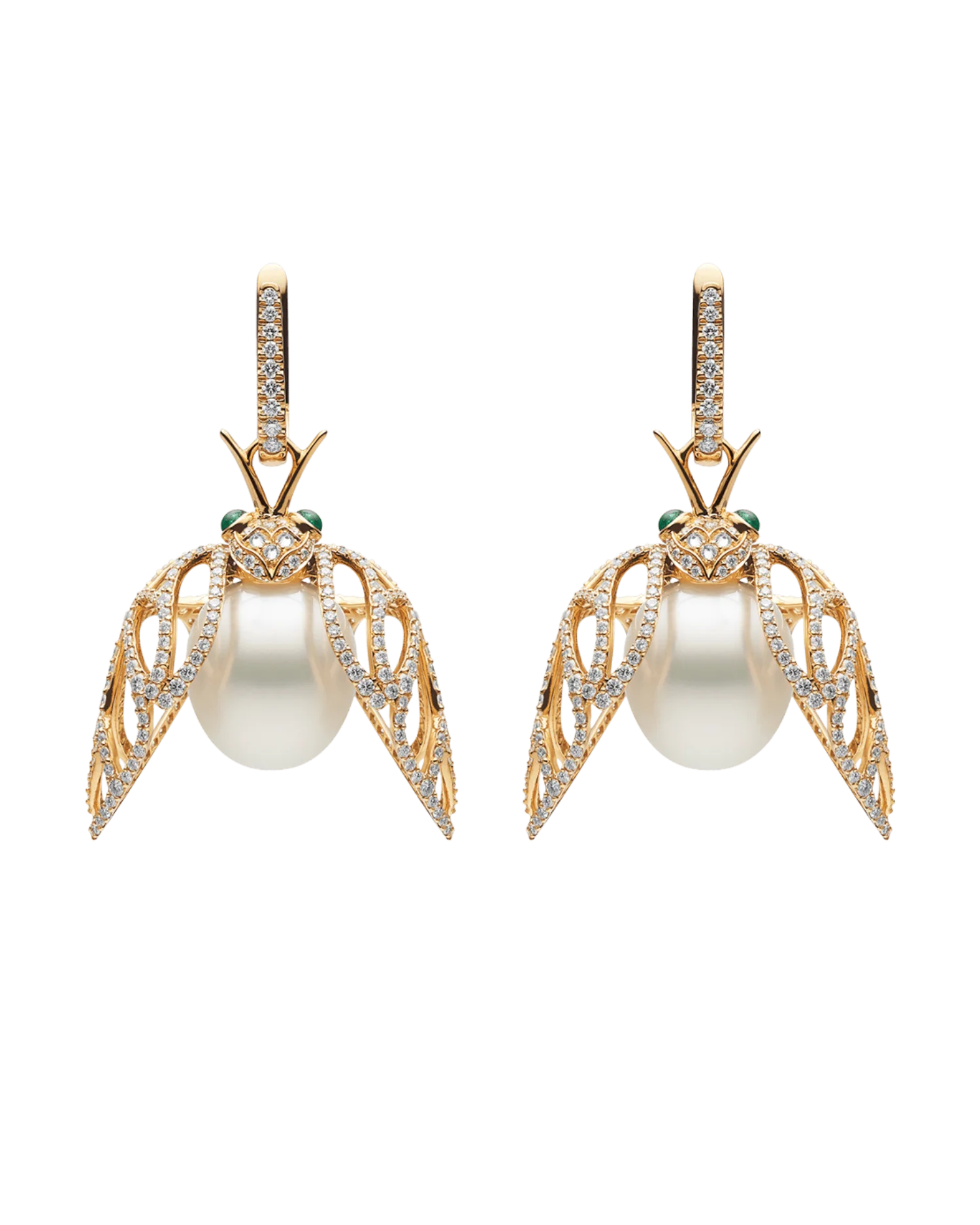 Emerging to herald Monsoons in Australia’s north-west, these earrings are a tribute to nature's rhythm. Crafted from 18K yellow gold, each articulated Cicada earring opens with a gentle touch, revealing a radiant 12–13mm Oval Australian South Sea pearl. The wings, pavé-set with white diamonds, can be styled open or closed with a gentle touch, offering a new sense of wonder with every wear.